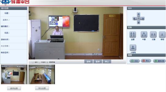 l 全自动录播方式(无人值守全自动录制方式,准确率更高:教师图像和学生图像都不需要任何人员干预,图像的跟踪、切换、图像定位、图像聚焦、图像逻辑流程、录制等全部由程序完全自动完成)。l 半自动录播方式(教师无需人工干预,学生由上课老师直接干预图像的切换聚焦,也不需要上课老师以外的老师来参与课堂录制,实用的半自动录播方式,录制课程正确率100%)。